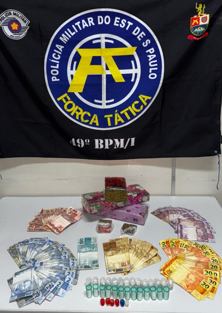 Ao verificar a bolsa dispensada, foi localizada uma quantidade de drogas e dinheiro em espécie (R$1.889,00). Nesse momento, uma mulher identificada como B.M.S.R.F. se apresentou à equipe como esposa do suspeito e informou que ele armazenava mais entorpecentes dentro de sua residência.