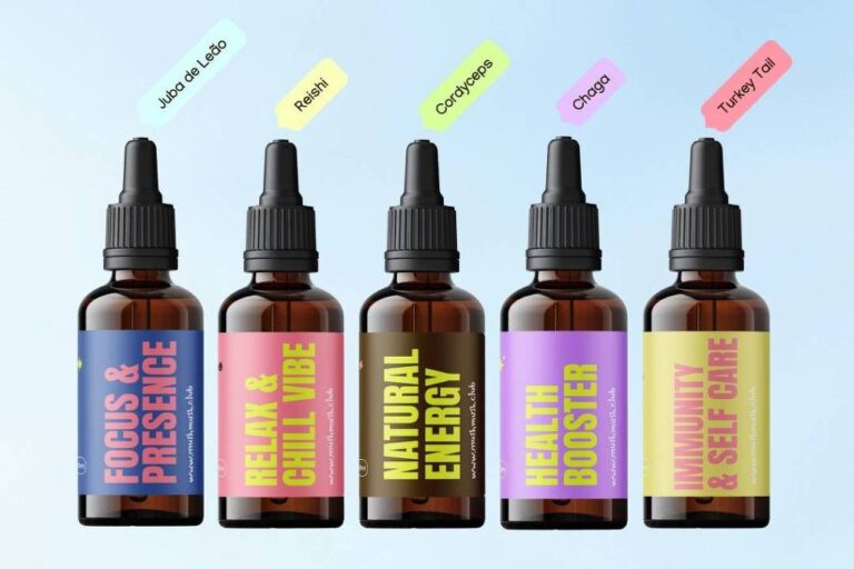 São eles: Juba de Leão, Reishi, Cordyceps, Chaga e Turkey Tail, todos da linha Mushdrop.