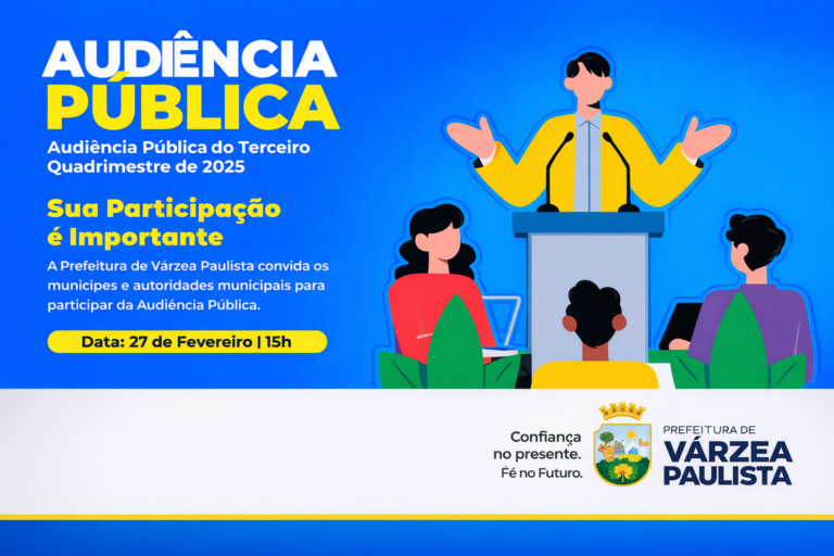 A Prefeitura de Várzea Paulista convida os munícipes e autoridades municipais para participar da Audiência Pública do Terceiro Quadrimestre de 2025, que acontece dia 27 de fevereiro, às 15 horas, no Plenário da Câmara Municipal de Várzea Paulista, localizado na Avenida Fernão Dias Paes Leme, 284 – Centro. A apresentação é realizada pela Unidade Gestora de Finanças.