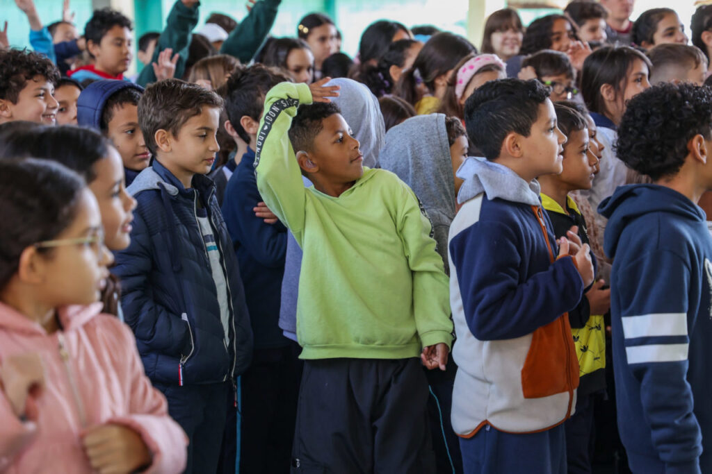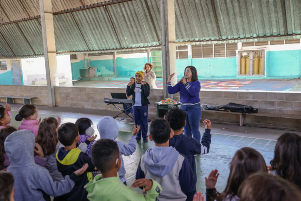Nem o frio da manhã desta segunda-feira (11) foi capaz de conter a animação dos estudantes da Emeb Professora Anna Rita Alves Ludke, que receberam a equipe do Coral Infantojuvenil Cidade das Crianças para uma aula aberta na quadra. Divididos em duas turmas, os cerca de 300 estudantes do 1º ao 5º ano do Ensino Fundamental 1 da vila Alvorada receberam a regente Jéssica Augusto e a pianista Mariana Borges para uma atividade de experimentação de ensaio, realização de exercícios básicos de postura, ritmo, afinação e notas, e, de quebra, ainda deram conta de ensaiar e apresentar a música “Tudo o que eu canto” entre os colegas.