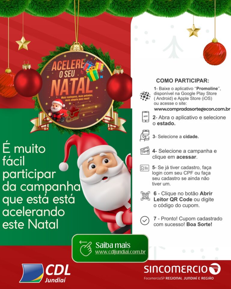 A Campanha “Acelere o Seu Natal”, promovida pela CDL e pelo Sincomercio Jundiaí e Região, encerra-se nesta quarta-feira (24). A iniciativa tem como objetivo valorizar o comércio local e incentivar as compras de fim de ano, oferecendo prêmios aos consumidores. A cada R$ 50 em compras nas lojas participantes, identificadas com o selo da campanha, o cliente recebe um cupom para concorrer a duas motos Honda (PCX DLX ABS e Elite 125), além de vale-compras e brindes. O sorteio das motos será realizado pela extração da Loteria Federal no dia 27 de dezembro.