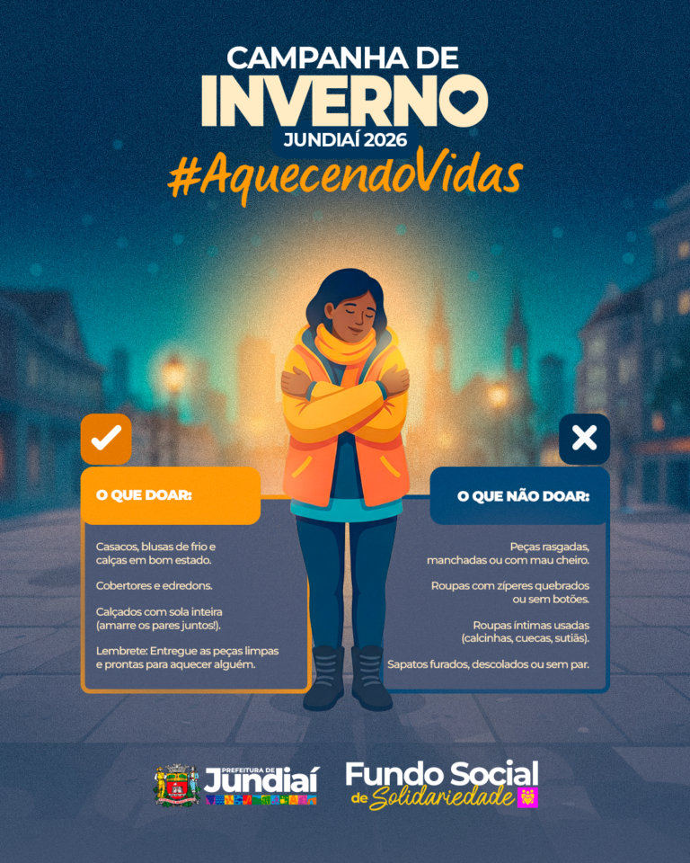 Com a chegada do inverno, o Fundo Social de Solidariedade de Jundiaí antecipou o início das arrecadações de itens de frio, como cobertores, roupas e calçados, e lançou oficialmente, na noite desta terça-feira (7), a Campanha de Inverno ´Aquecendo Vidas´ 2026. A iniciativa é um convite à solidariedade e ao engajamento coletivo para apoiar famílias em situação de vulnerabilidade.