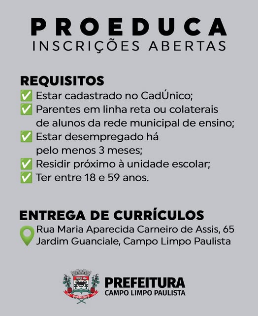 Contemplados nesta primeira chamada devem efetivar a matrícula de 12/12 a 18/12/2024 e 22/01 a 21/02/2025 A Unidade Gestora Municipal de Educação de Várzea Paulista publica a primeira chamada para matrículas em creches municipais de 2025. Para verificar se a criança foi contemplada, basta acessar o link https://tinyurl.com/y4c5b8e2, digitar o código e clicar em “Pesquisar”. Os contemplados […]