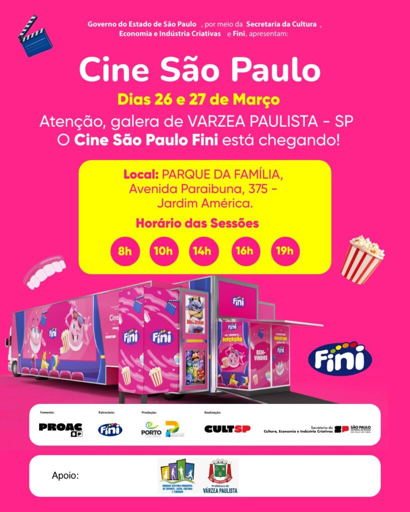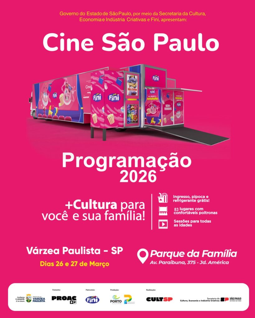 A ação integra o projeto Cine São Paulo Fini, realizado pelo Governo do Estado de São Paulo, por meio da Secretaria da Cultura, Economia e Indústria Criativas, com apoio da Prefeitura de Várzea Paulista. A programação também conta com a parceria da Unidade de Educação do município e deverá contemplar cerca de 600 crianças das escolas municipais, ampliando o acesso dos estudantes à atividade cultural.
