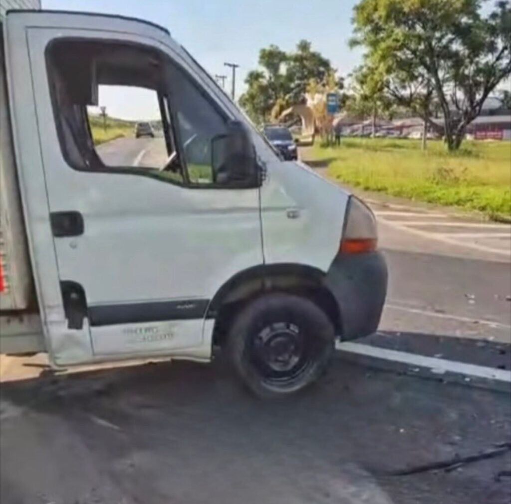 A colisão envolveu uma caminhonete Fiat Toro e um caminhão. Com o impacto, o motorista da caminhonete e o passageiro do caminhão ficaram feridos.