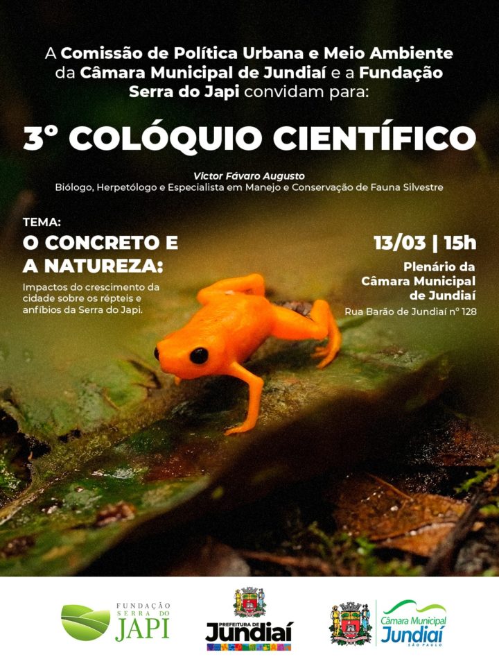 A Fundação Serra do Japi e a Comissão de Política Urbana e Meio Ambiente da Câmara Municipal de Jundiaí realizam, no dia 13 de março, às 15h, o 3º Colóquio Científico com o tema “O Concreto e a Natureza: impactos do crescimento da cidade sobre os répteis e anfíbios da Serra do Japi”. O encontro será aberto ao público e acontece na plenária da Câmara (Rua Barão de Jundiaí, 128, Centro).