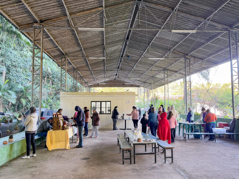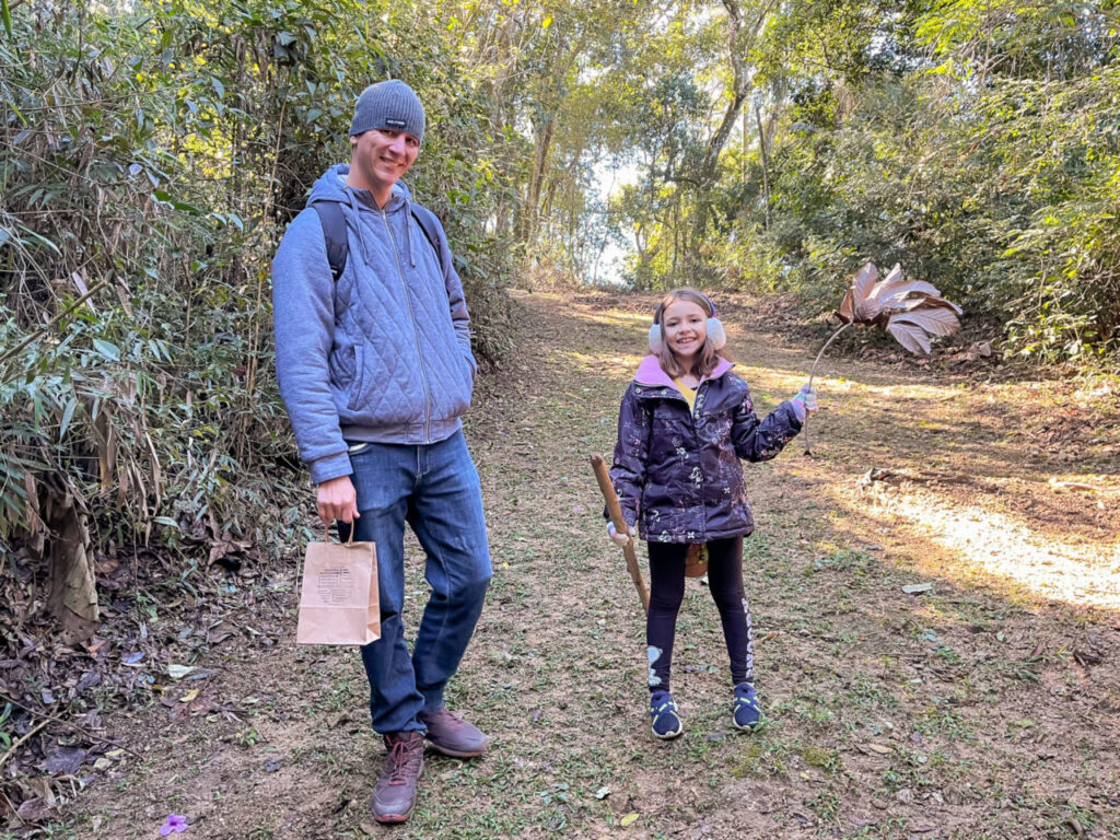 Já na descida, as crianças foram provocadas a coletar elementos da natureza já desprendidos pela trilha, para participar de uma oficina de Ateliê da Floresta. A Maria Luísa Nubiato, de sete anos, coletou flores e folhas para sua atividade. “Aprendi que não podemos arrancar nem cortar as plantas, porque isso deixa a floresta e os animais tristes. Também aprendi que Japi, o nome da serra, significa castelo de águas, porque o solo aqui favorece que tenham muitas nascentes aqui”, comentou a estudante de sete anos, acompanhada do pai, o professor de Arte Gabriel.