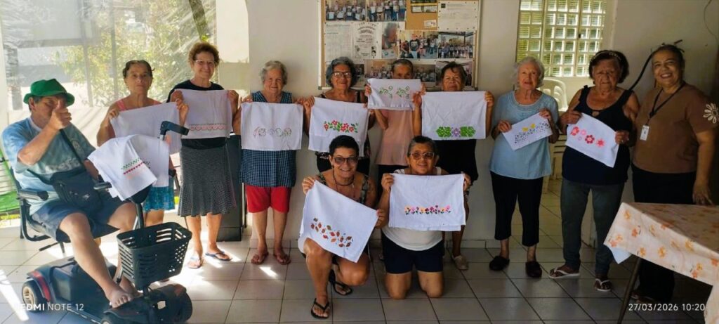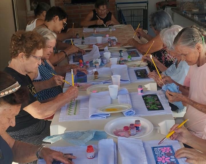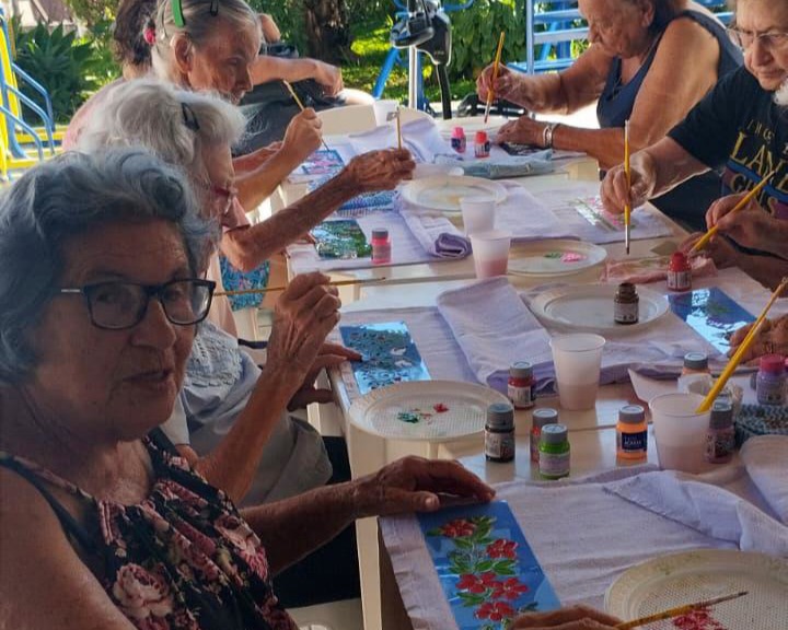 Uma manhã leve, marcada por cores e boas conversas, reuniu moradores do Condomínio dos Idosos, no bairro Fazenda Grande. Entre as atividades rotineiras, uma se torna cada vez mais especial: a oficina de pintura em pano de prato, uma das preferidas dos moradores. Entre tintas e cores, os parceiros de moradia se divertem numa conversa animada, cheia de risos e boas lembranças.