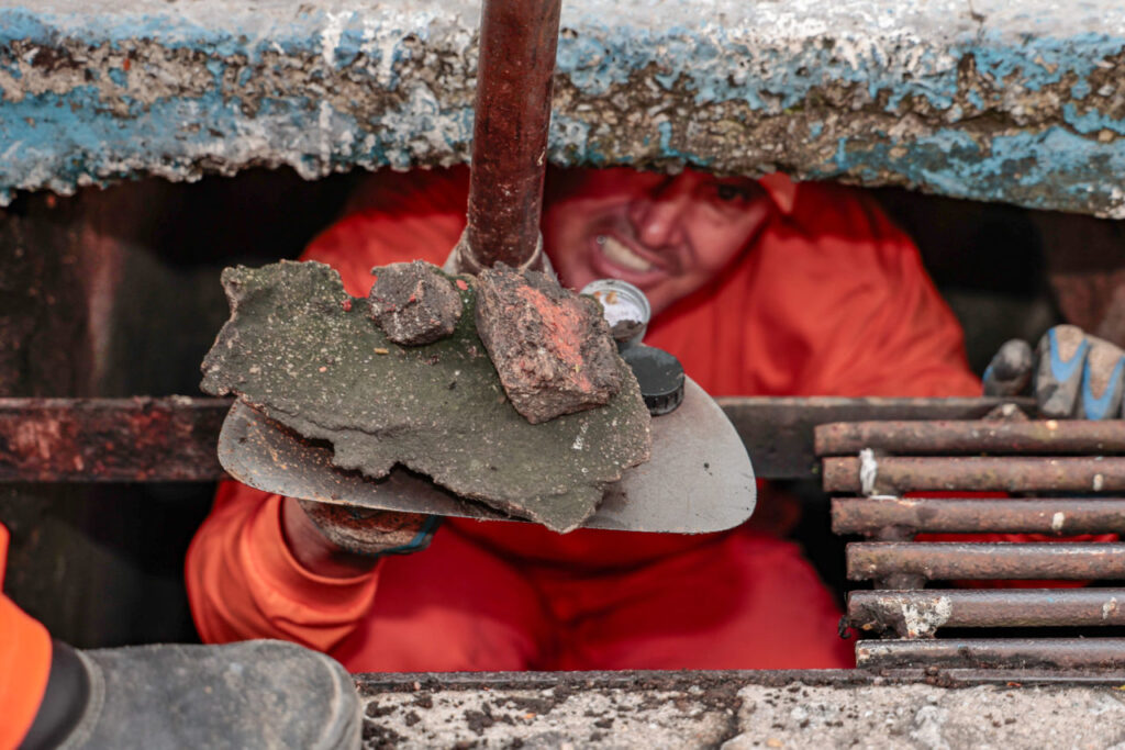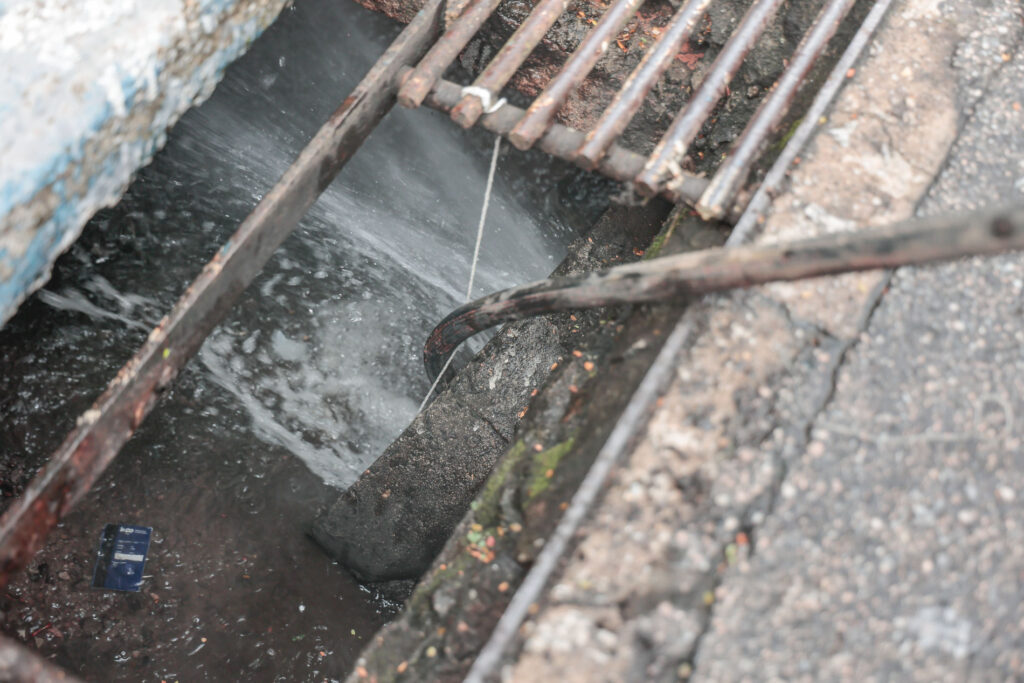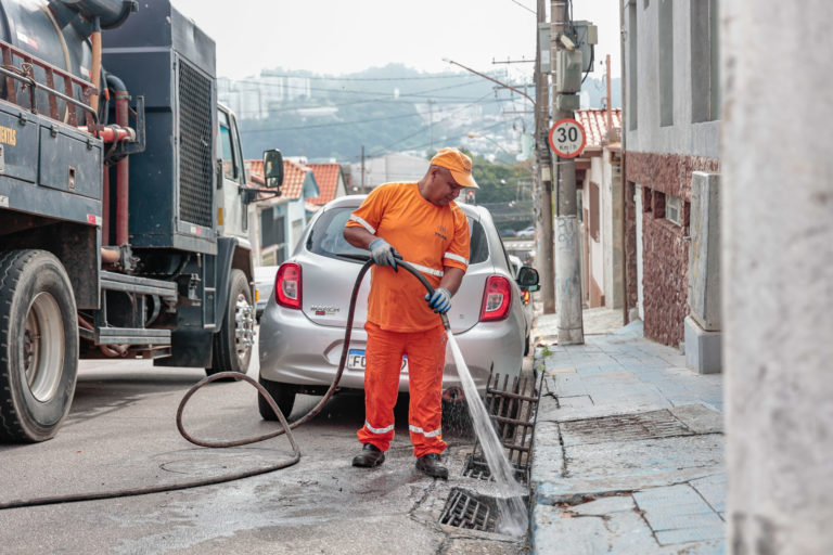 Além da limpeza manual das bocas de lobo, o trabalho conta com a tecnologia do hidrojateamento, um processo eficiente que utiliza um jato de água em alta pressão para desobstruir tubulações e redes de esgoto.