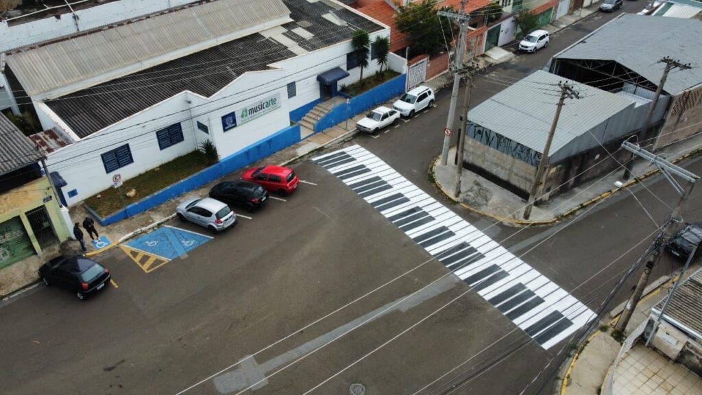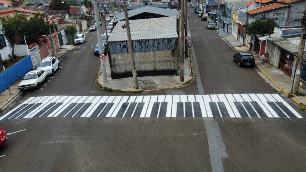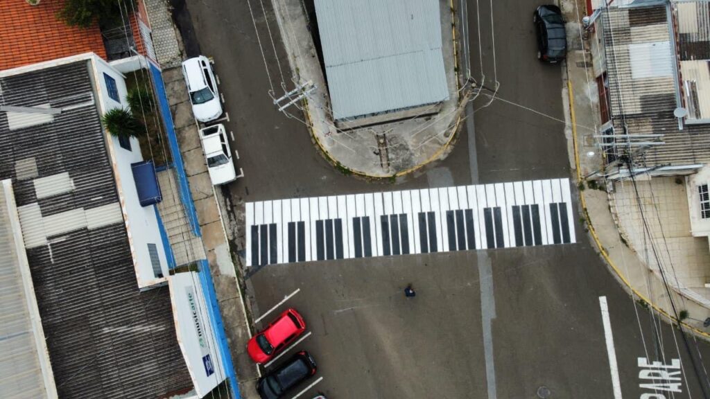 A rua Manoel Gonçalves, em Várzea Paulista, ganhou nesta terça-feira (12) uma faixa de pedestres com desenho inspirado nas teclas de um piano. A pintura artística foi feita em frente à Musicarte – Escola Municipal de Música e Artes – e une segurança viária, acessibilidade e valorização cultural.