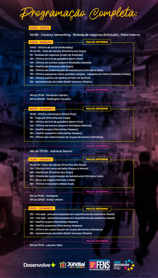 A 8ª edição da FENS – Feira do Empreendedor, Negócios e Serviços será realizada nos dias 6, 7, 8 e 13, 14 e 15 de março de 2026, no Parque Comendador Antônio Carbonari (Parque da Uva), em Jundiaí. A programação do palco interno reforça o posicionamento da FENS como um espaço voltado à conexão, ao aprendizado e ao entretenimento para toda a família, reunindo iniciativas de empreendedorismo, atividades infantis, moda, sustentabilidade e cultura em um ambiente acessível e diversificado. O evento contará com estacionamento gratuito para os visitantes.