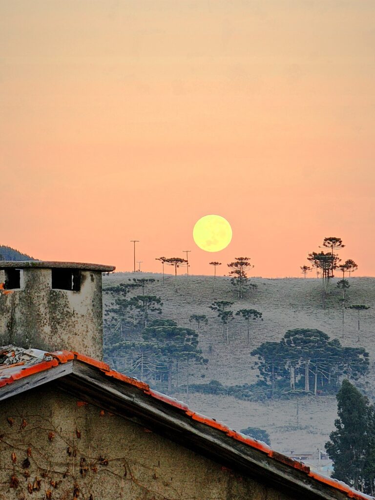 As imagens capturadas hoje no município mostram o contraste perfeito entre o frio intenso e a beleza serena das montanhas e araucárias. Na primeira foto, é possível ver a grama completamente congelada, com o chão esbranquiçado e o sol ainda tímido iluminando suavemente as encostas. Já na segunda imagem, o amanhecer ganha um toque mágico com a lua cheia ainda visível no céu alaranjado, compondo uma cena digna de cartão-postal.