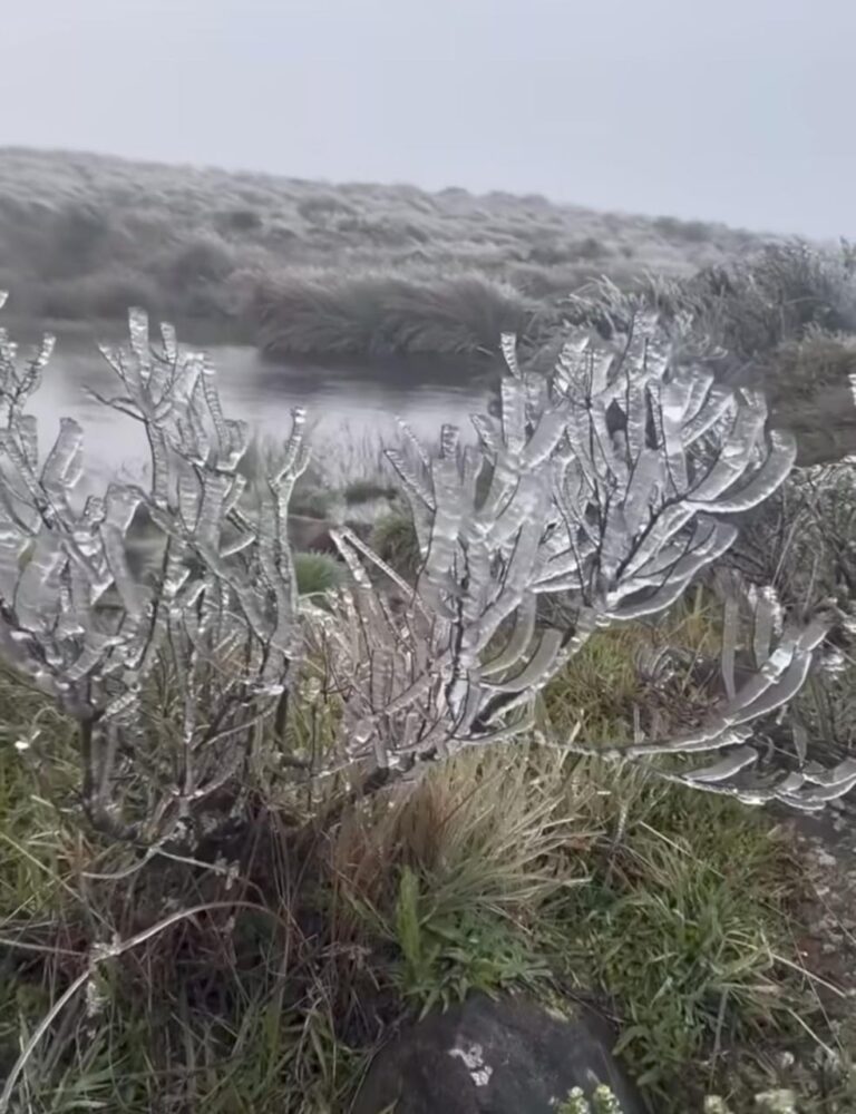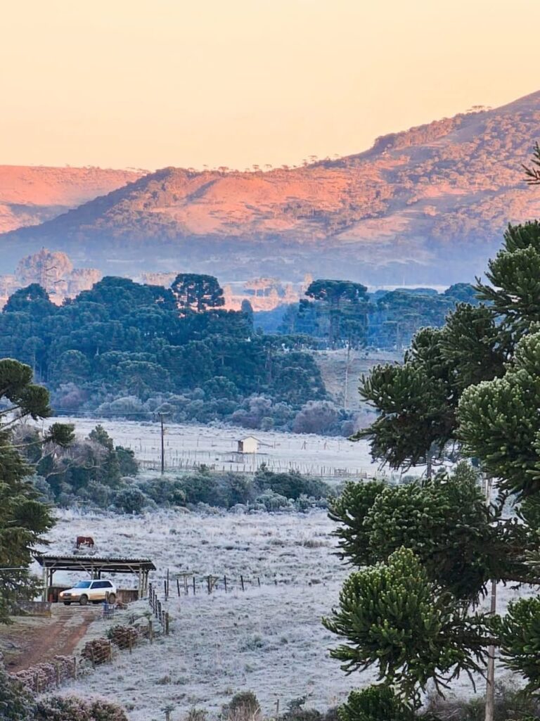 A forte massa de ar polar que avança pelo Sul do Brasil tem derrubado as temperaturas em diversas cidades da região, mas foi em São Joaquim que o frio se destacou de forma mais intensa nesta madrugada. Conhecida por seus invernos rigorosos, a cidade volta a atrair olhares de todo o país por sua beleza única em dias de geada.