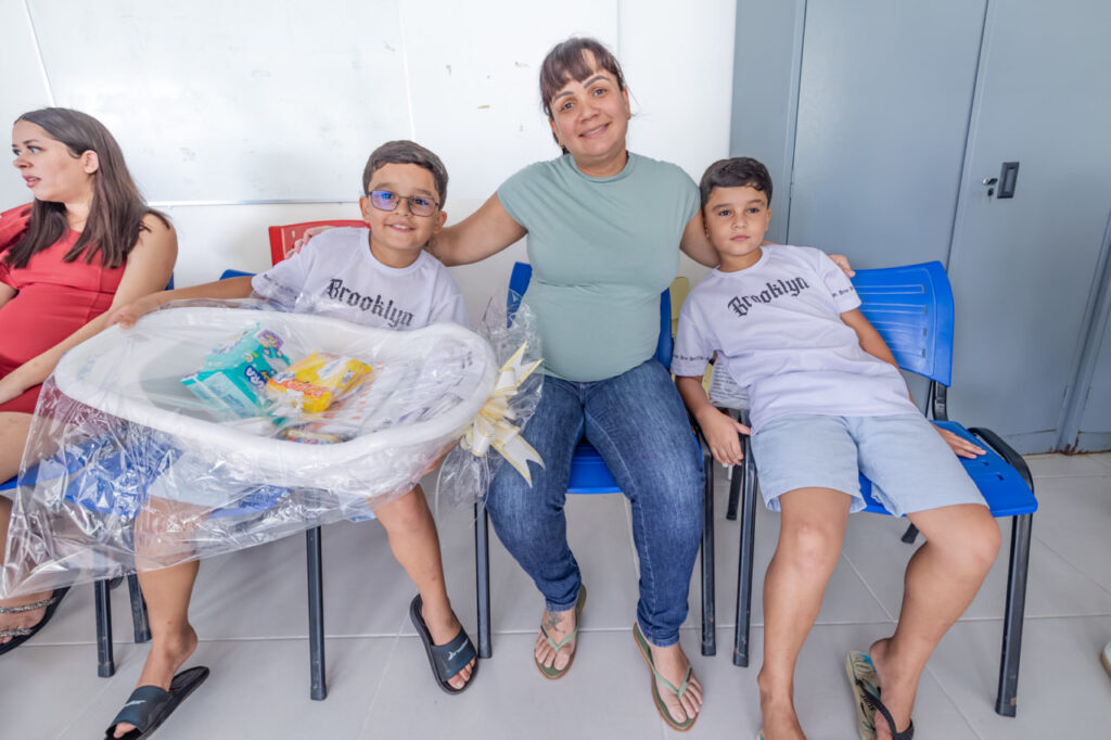 Ana Paula de Araújo, 38 anos, foi uma das gestantes presenteadas com o kit enxoval do projeto “Colo de Mãe”, na UBS Guanabara. Grávida de 8 meses de Benício, seu terceiro filho, ela diz que o bebê é um presente muito aguardado por ela e pelos irmãos gêmeos, Lorenzo e Miguel, de 8 anos.