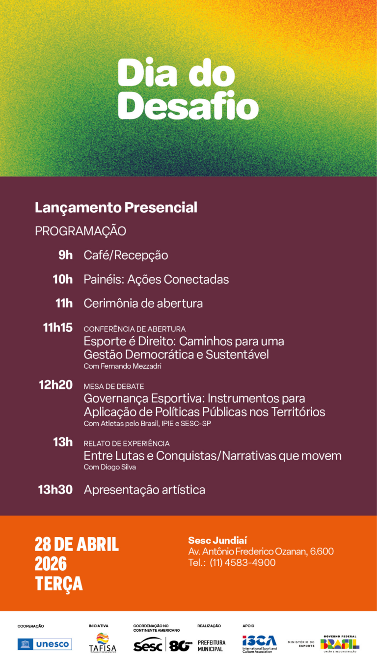 Iniciativa da TAFISA, o Dia do Desafio conta com a cooperação da UNESCO, apoio da ISCA (International Sport and Culture Association) e do Ministério do Esporte do Governo Federal, sob coordenação do Sesc São Paulo no continente americano. Realizada em parceria com as Prefeituras Municipais, a campanha deste ano traz o tema “Esporte é Direito!”.