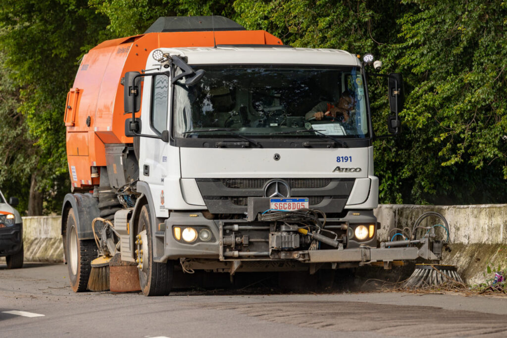 O equipamento agiliza a limpeza das vias e contribui para a desobstrução das galerias pluviais. O caminhão possui vassouras laterais e central, além de sistema de supressão de poeira com pulverizadores de jato de água.