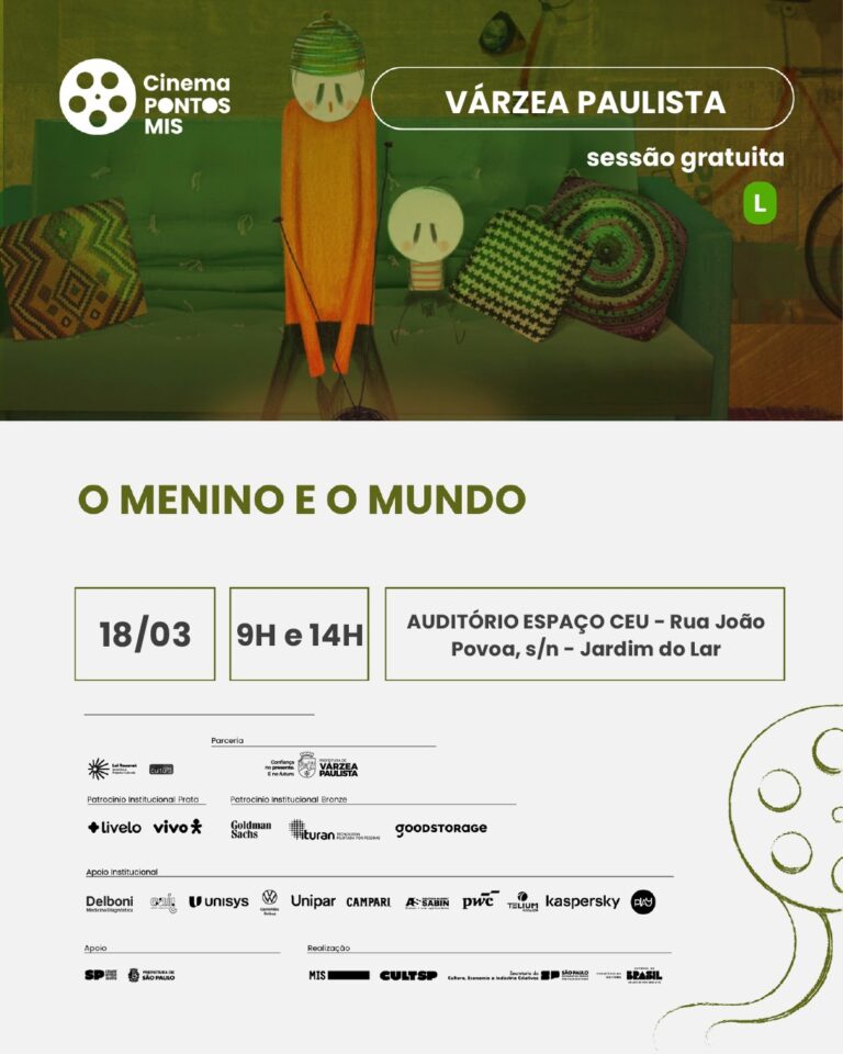O auditório da Praça CEU de Várzea Paulista será o palco de novas exibições cinematográficas gratuitas do Pontos MIS, na quarta-feira (18). O público poderá curtir a animação brasileira O Menino e o Mundo, que conta a história de um garoto que sofre pela falta do pai e decide deixar a sua aldeia, descobrindo um mundo fantástico dominado por máquinas-bichos e estranhos seres. A inusitada animação de 2013, do diretor Alê Abreu, conta com várias técnicas artísticas que retratam as questões do mundo moderno através do olhar de uma criança.