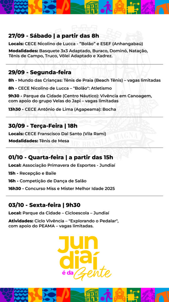 A Prefeitura de Jundiaí, por meio da Secretaria Municipal de Esporte e Lazer (SMEL), abriu as inscrições para os Jogos+60 2025, destinados a pessoas com 60 anos completos ou mais (nascidas em 1965 ou antes). Podem participar tanto representantes de instituições quanto atletas avulsos.