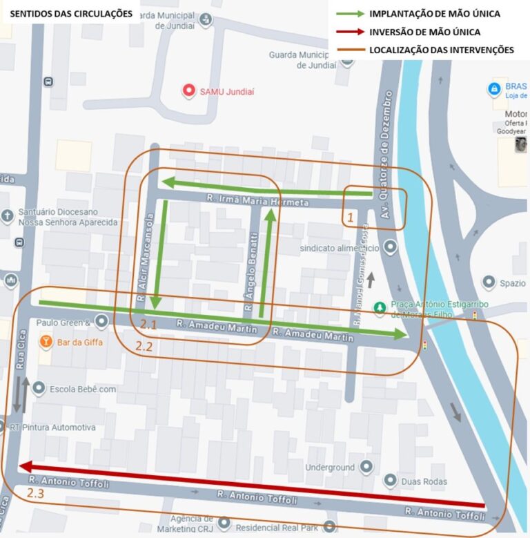 Com isso, as ruas paralelas Alcir Marcansola (sentido Rua Amadeu Martin) e Ângelo Benatti (sentido Rua Irmã Maria Hermeta) deixam de ter mão dupla e passam a ter mão única (opostas entre si). Isso também ocorrerá com as ruas Irmã Maria Hermeta (sentido Rua Alcir Marcansola) e Amadeu Martin (sentido Av. Catorze de Dezembro) e com a Rua Amadeu Martin (sentido Av. Catorze de Dezembro), que deixa de ter mão dupla e formará um binário com a Rua Antônio Toffoli. Esta última terá sua mão única invertida, passando a operar no sentido da Rua Cica.
