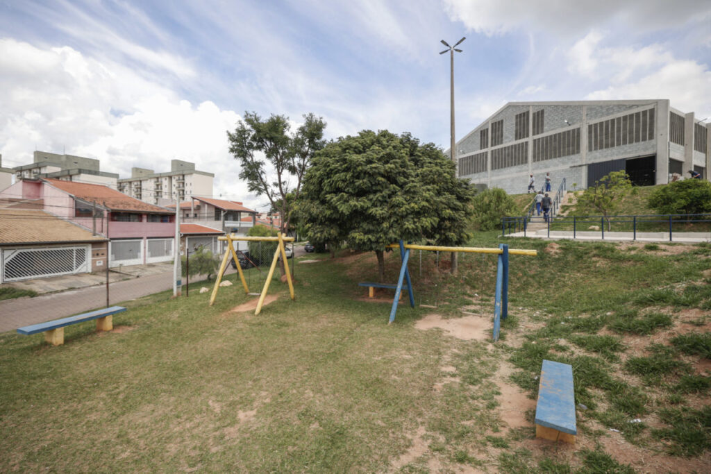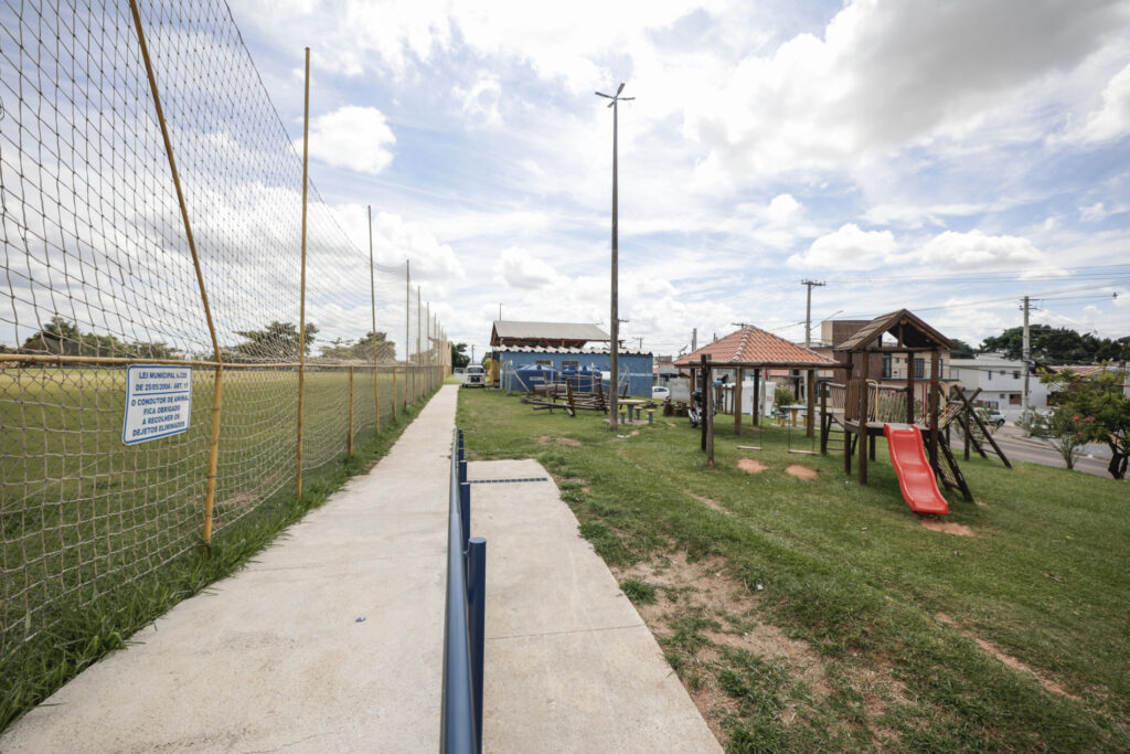 A manutenção do Centro Esportivo Léo Pereira também inclui roçagem da área verde, pintura e manutenção dos equipamentos infantis e melhor distribuição dos corrimãos.