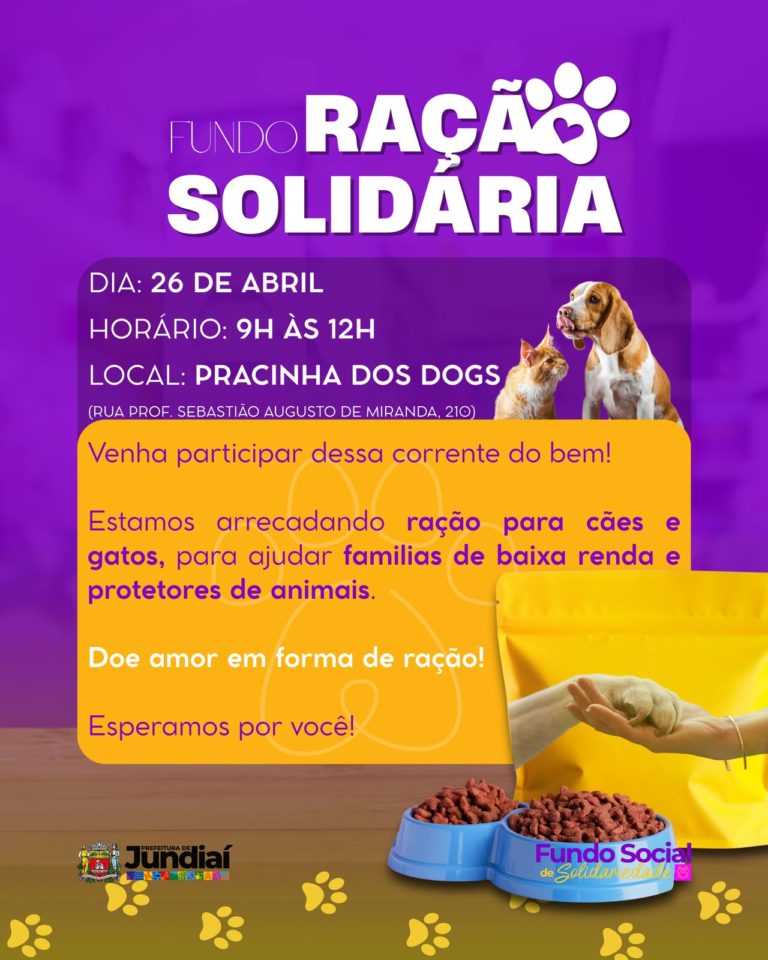 Neste sábado (26), das 9h às 12h, a Pracinha dos Dogs será palco de uma ação solidária e de conscientização promovida pelo Fundo Social de Jundiaí em parceria com o Departamento de Bem-Estar Animal (DEBEA). Localizado na Rua Prof. Sebastião Augusto de Miranda, 210, o espaço recebe o evento que tem como objetivo arrecadar doações de ração para o Fundo Ração Solidária e oferecer microchipagem gratuita de cães e gatos.