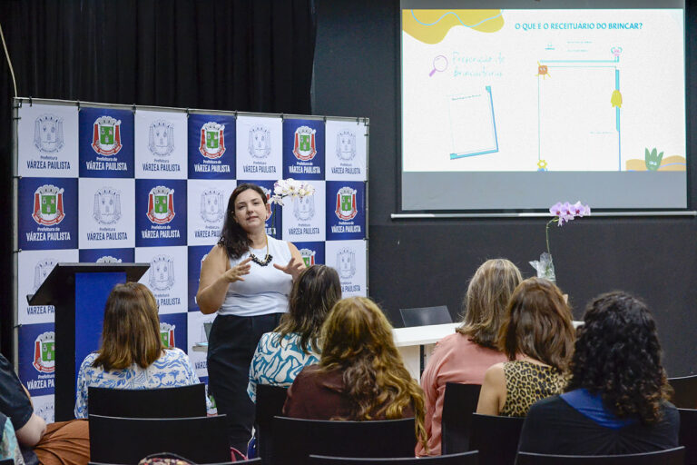 Profissionais da Rede da Primeira Infância de Várzea Paulista participaram, nesta quarta-feira (15), de um encontro no auditório da Praça CEU para discutir o “Receituário do Brincar”, iniciativa que propõe a inclusão de brincadeiras e vínculos afetivos como parte do cuidado integral às crianças.