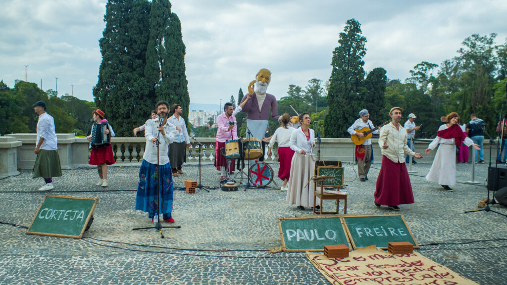 A literatura aparece na mediação Histórias do Nosso Quintal: Palavras d’água, do Núcleo Ferruada. A atividade propõe uma imersão no universo dos quintais — espaços de convivência, brincadeira e imaginação — reunindo narrativas populares sobre caminhos e nascentes das águas, entrelaçadas a jogos e brincadeiras tradicionais.