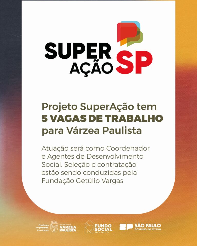 O SuperAção SP, ação desenvolvida pelo Governo de São Paulo, está com vagas abertas para Coordenador e Agentes de Desenvolvimento Social. São 187 vagas abertas para municípios das regiões da Grande São Paulo, Baixada Santista, Campinas e Sorocaba, destas cinco são para atuar em Várzea Paulista. A seleção e contratação estão sendo conduzidas pela Fundação Getúlio Vargas (FGV Projetos).