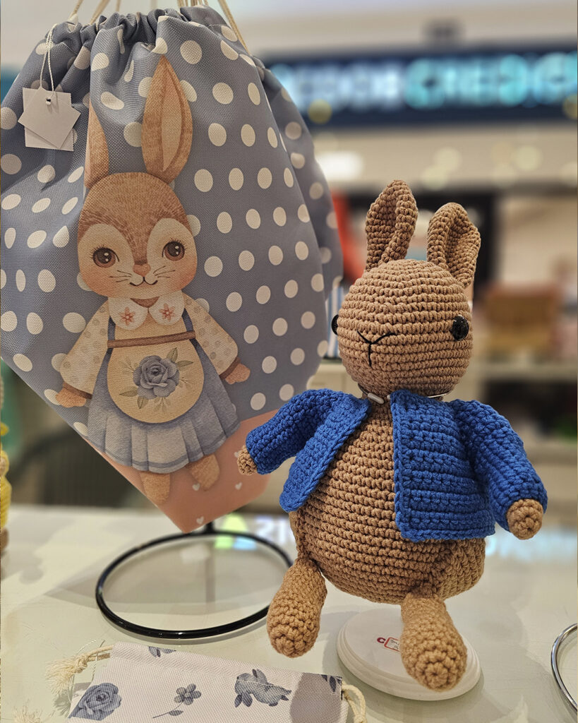 No local estão expostos trabalhos como: coelhos e enfeites de Páscoa, nécessaire e