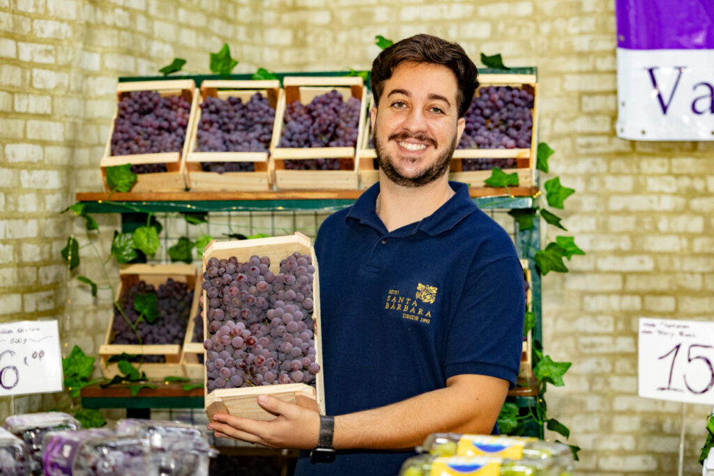 A Festa da Uva também é espaço de memória e continuidade. O produtor Matheus Oliveira, do Sítio Santa Bárbara, participa do evento há anos e carrega uma história que começou em 1922.