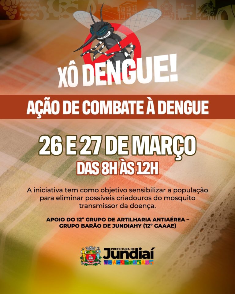 Reforçando as ações de combate à dengue, a Prefeitura de Jundiaí realiza, nesta quinta (26) e sexta-feira (27), mais uma força-tarefa da campanha “Xô Dengue”, voltada à eliminação de criadouros do mosquito Aedes aegypti. A mobilização conta com o apoio do Departamento de Limpeza Pública (LIMPUB), da Secretaria de Infraestrutura e Serviços Públicos (SMISP), para o recolhimento de materiais inservíveis, e será realizada das 8h às 12h, no bairro Tamoio (quinta) e no Tarumã (sexta).